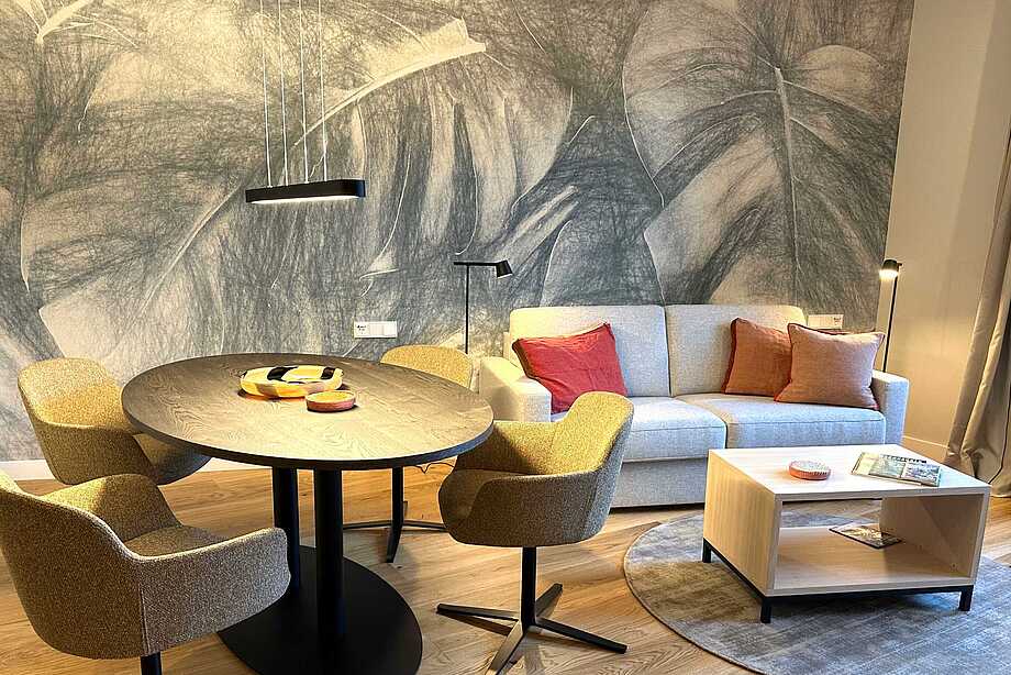Our Grand Deluxe Suite offers 54 m² of space for relaxed living and working. It is generously sized, bright, and comfortably furnished, featuring separate living and sleeping areas.