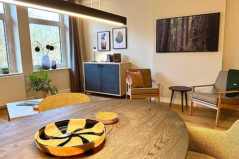 Our Deluxe Suite offers 40 m² of space for comfortable living and working. It is spacious, bright, and tastefully furnished, featuring separate living and sleeping areas.